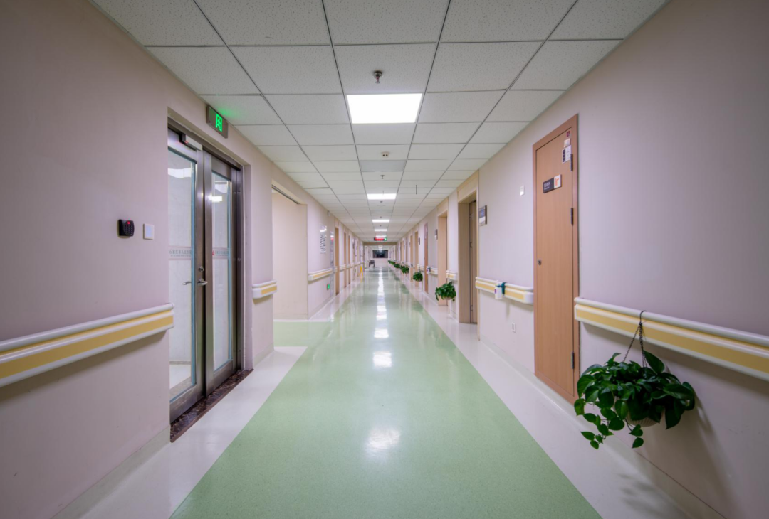 住院樓走廊采用礦棉吸音板吊頂,防火吸音性能好,同時,該產品具有不燃性能,提高了醫院的防火安全性。地面采用PVC地板膠,防滑耐磨、吸音減震,是建設現代化醫院的環保用材。