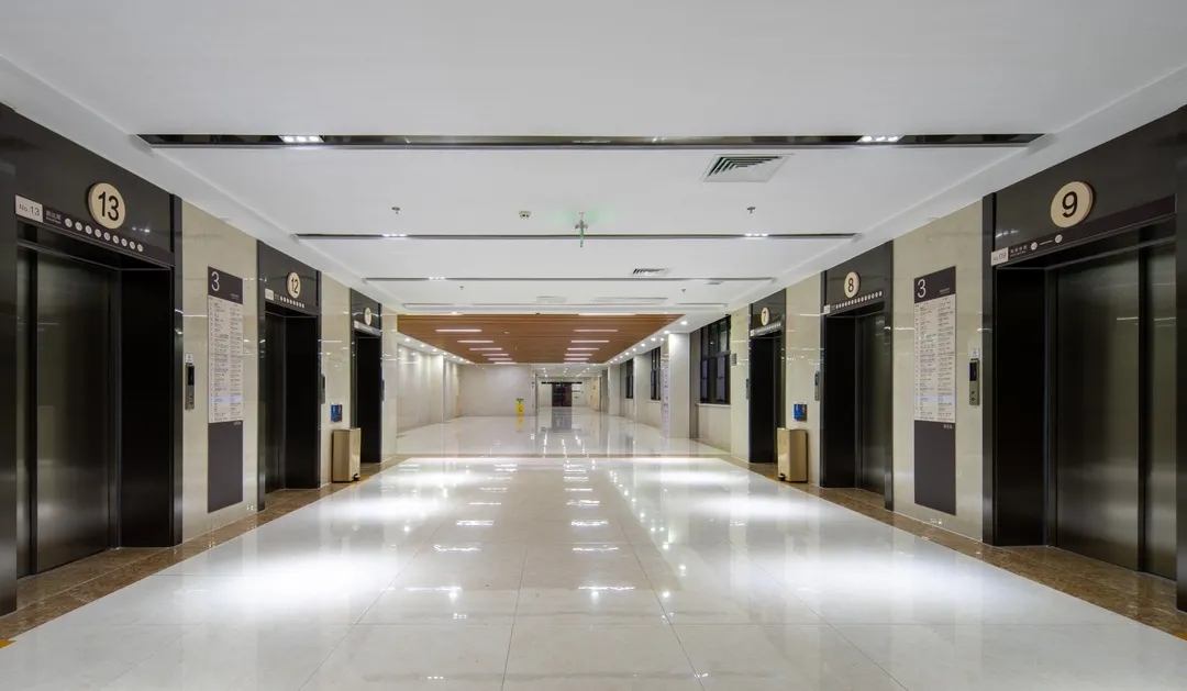 電梯廳天花采用石膏板吊頂輔以不銹鋼裝飾增加線條感及層次感,同時與不銹鋼電梯套口交相輝映,地面采用大理石提升整體裝修檔次。