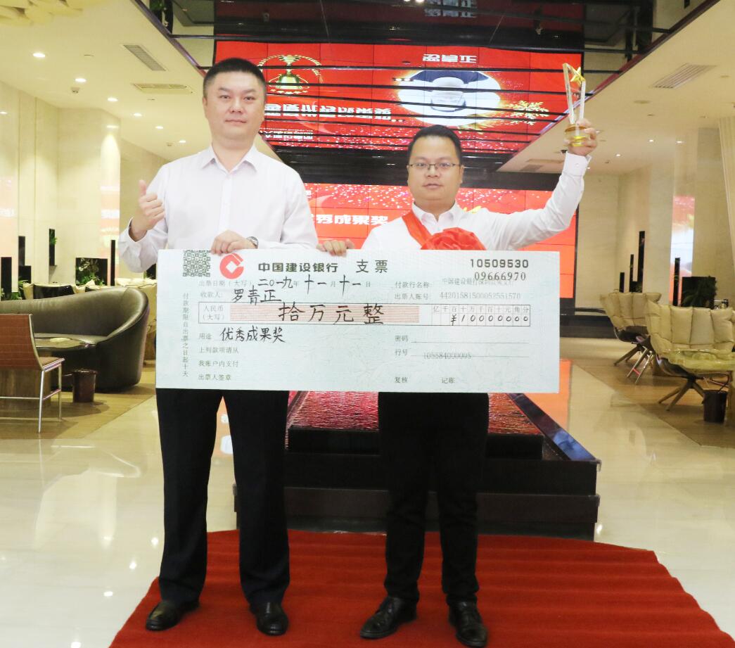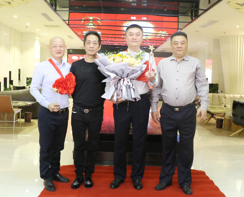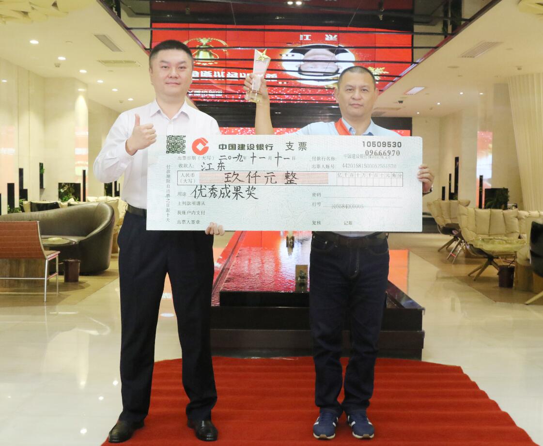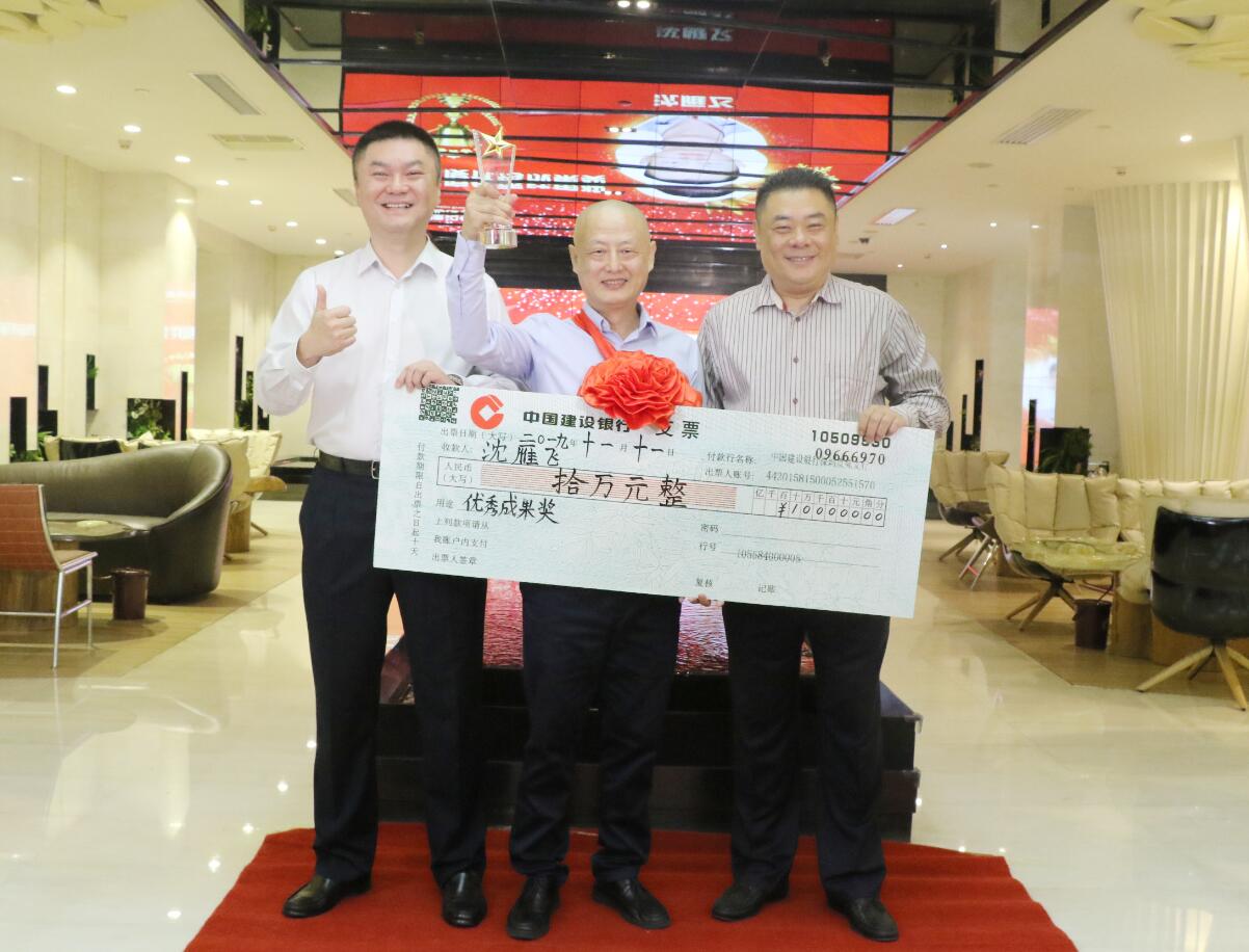 集團(tuán)常務(wù)副總裁沈雁飛在集團(tuán)業(yè)務(wù)拓展中做出突出貢獻(xiàn),被授予優(yōu)秀成果獎(jiǎng),獎(jiǎng)勵(lì)10萬元。圖為徐凱宏董事長(zhǎng)、黃河副董事長(zhǎng)與獲獎(jiǎng)?wù)吆嫌傲裟睢?br />