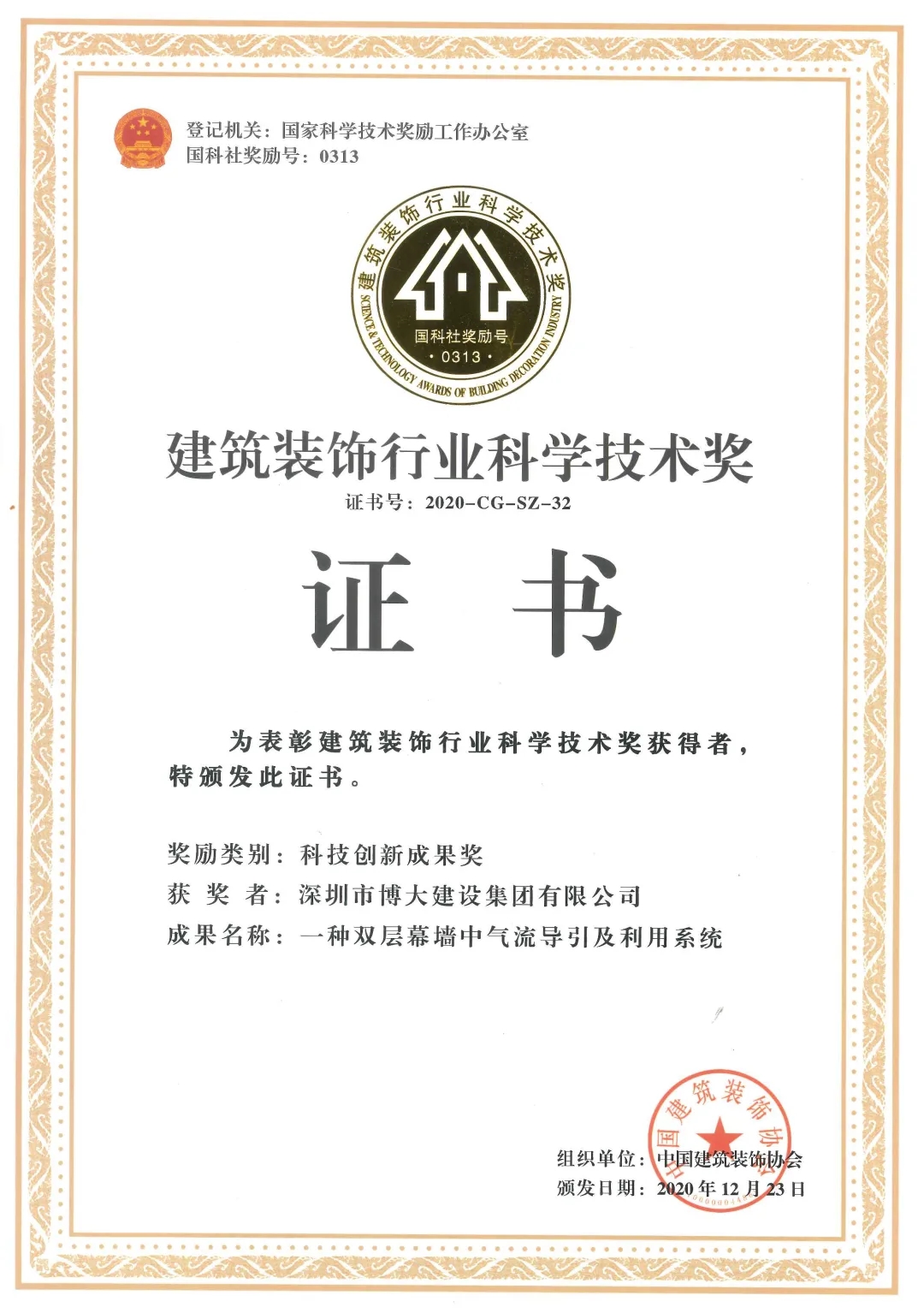 博大研發(fā)的一種雙層幕墻中氣流導引及利用系統(tǒng)創(chuàng)新技術榮獲二0二0年全國建筑行業(yè)科技創(chuàng)新成果獎。
