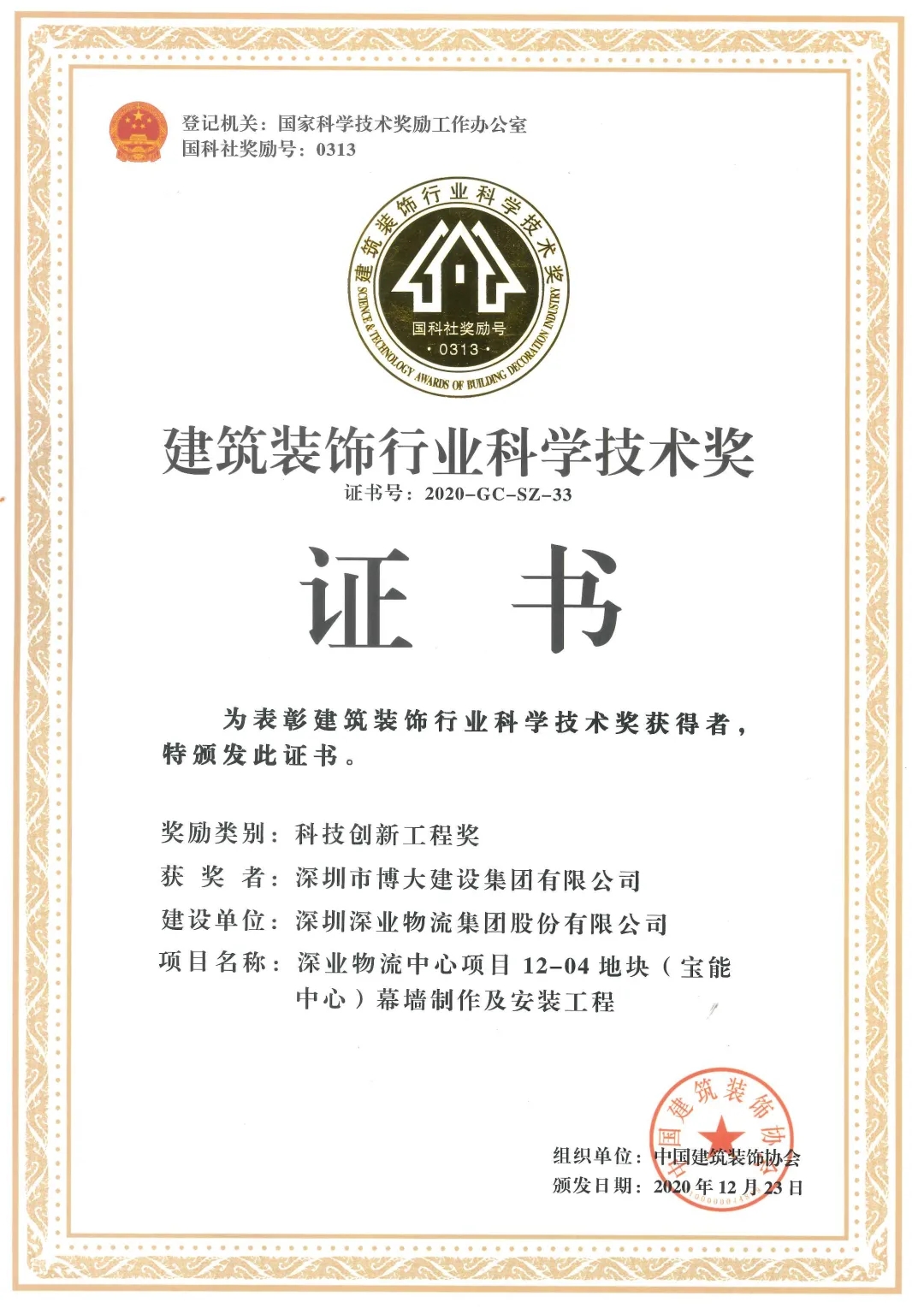 博大建設集團承建的“深業(yè)物流12-04地塊(寶能中心幕墻制作及安裝工程)”榮獲二0二0年全國建筑行業(yè)科技創(chuàng)新工程獎。